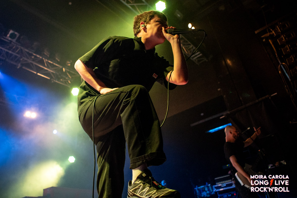 Alla fine è arrivato il momento che tutti aspettavano… e ragazzi, i Knocked Loose non ci hanno deluso per niente. Fin da subito capiamo a che tipo di spettacolo stavamo per assistere, visto che salgono sul palco partendo a cannone con Deep in the Willow; il suo fragoroso breakdown e il mosh di “KNOCKED LOOSE motherfucker” minacciano di far saltare il tetto ancor prima della fine della prima canzone. Il set di stasera comprende canzoni estratte da quasi tutti i loro lavori, e i più nostalgici non possono fare a meno di impazzire al solo sentire le prime note di All my Friends e Oblivion’s Peak. Non c’é una persona nella stanza che non urla ad ogni canzone o non fa headbanging come un pazzo, e anche il frontman Bryan Garris lo ha notato, mostrando sempre un gran sorriso a tutti noi. Anche se non sembrano esserci tante parole, con la sua presenza imponente gli basta abbaiare una sola volta per far sì che le persone saltino l’una sull’altra, e questa è una vera e propria ricetta per la carneficina. L’intensità è altissima, con gli accordi dissonanti dei chitarristi Isaac Hale e Nicko Calderon, le bombe di rullante di Kevin “Pacsun” Kaine e il basso cavernoso di Kevin Otten che la amplificano ad un livello ancora più elevato. Tutto questo si nota particolarmente durante Belleville e Mistakes Like Fractures, con cui generano un enorme boato nel pubblico, che a sua volta si scatena ancora di più nel pit, fra mosh, circle pit, wall of death e two-step alternati in continuazione. Ma il momento più atteso e stato quando verso metà del set ci hanno regalato l’esecuzione di un loro inedito, Blinding Faith (qui il comunicato), che sarà sicuramente un loro prossimo successo, vista la reazione che ha scatenato fra tutti i presenti. La famosissima Counting Worms ha fatto emettere a tutto il pubblico un fragoroso “ARF ARF” prima di chiudere la serata con l’altrettanto devastante Everything is Quiet Now.