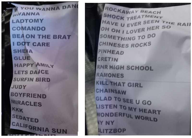 Trenta brani, una narrazione, una cronaca vissuta, un’esplosione di fantastici ricordi, passione vera, nessuna nostalgia ma solo vita. Dall’iniziale DO YOU WANNA DANCE, dal secondo album del 1977 ROCKET TO RUSSIA, fino alla conclusiva BLITZKRIEG BOP del debut del 1976, è stata pura follia, pura esaltazione musicale, puro divertimento. Un viaggio a velocità impressionante attraversando tutta la storia dei RAMONES, senza pause né compromessi, fedele a quello spirito rivoluzionario e ribelle. ONE, TWO, THREE, FOUR portato all’esasperazione, a ricordare come quel semplice rituale sputato prima di ogni assalto sonoro abbia cambiato per sempre le regole del Rock’n’Roll.