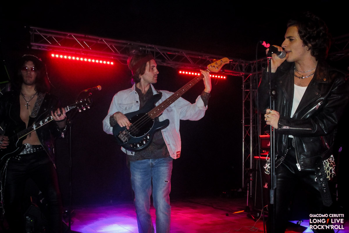 I primi a esibirsi sono i RAWSTRINGS band freschissima nata a Milano nel 2022, purtroppo si trovano di fronte alla platea quasi vuota ma senza perdersi d’animo, esordiscono con Black Dress Lady dando inizio allo show. I giovani rocker propongono pezzi inediti che andranno a comporre il futuro debut album, a differenza di tante band di ultima generazione rimangono fedeli al rock classico, tracciato dai riff e assoli ad opera di Morgan e Daveryan White, solidificati da Elia al basso e sostenute da corpose parti di batteria da parte di Teo. Il frontman Dany completa il sound con voce calda dal timbro sia soffice che marcato a seconda dell’andamento dei brani, ai quali aggiungono una cover dei Jet e di Elvis Presley, complessivamente i pezzi sono orecchiabili con una discreta tenuta di palco, vista la giovane età hanno molta strada da fare per trovare la giusta vena compositiva, per dare personalità al sound e acquisire maggior padronanza in sede live. Con Darlin’ Killed My Heart terminano il set raccogliendo applausi d’incoraggiamento, dimostrandosi un buon aperitivo in attesa del piatto forte, rimaniamo in attesa dell’uscita del primo disco per ascoltare i frutti dei loro sforzi.